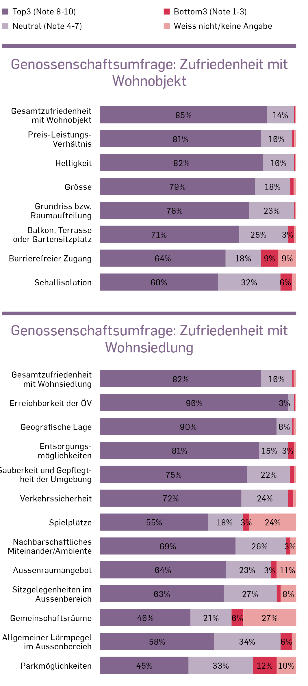Die Ergebnisse der Umfrage waren erfreulich: Die Gesamtzufriedenheit mit den eigenen Wohnobjekten lag bei 85 %. Besonders das Preis-Leistungs-Verhältnis, die Helligkeit und die Grösse der Wohnungen wurden geschätzt. 82 % der Befragten sind mit ihrer Wohnsiedlung zufrieden oder sehr zufrieden, vor allem die gute Verkehrsanbindung, die Lage und die Entsorgungsmöglichkeiten wurden positiv bewertet.