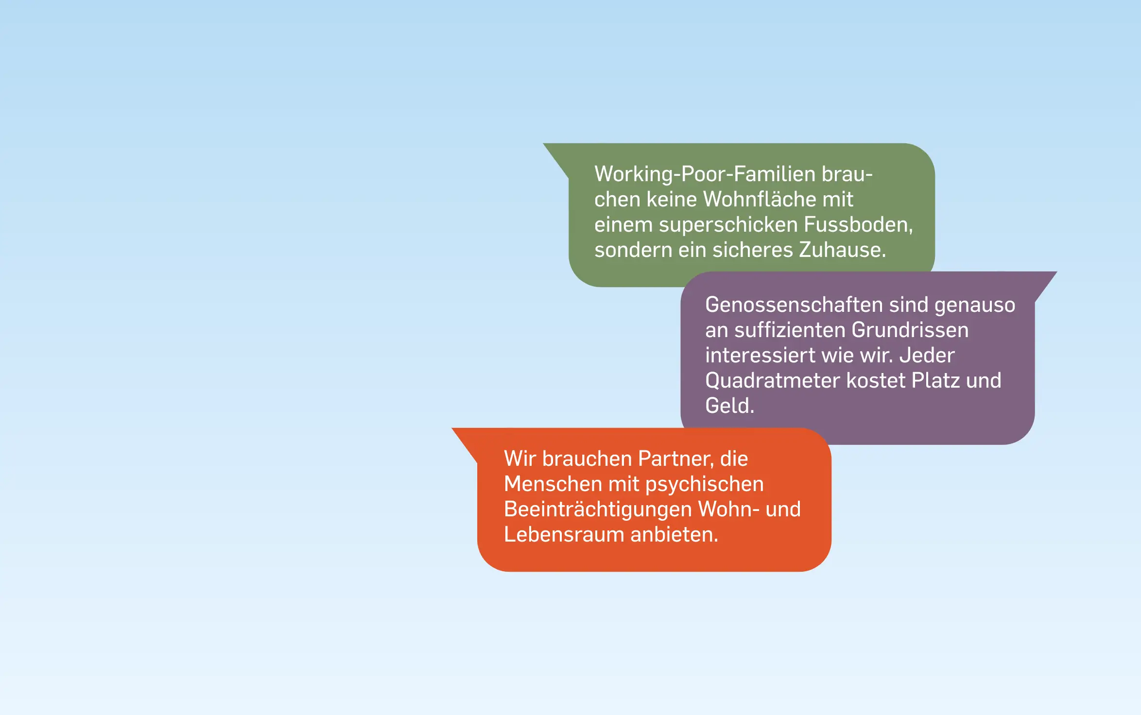 Ein eigenes Schaufenster bekamen zudem unsere Partnerorganisationen, welche als Fürsprecher einer Klientel mit ganz spezifischen Bedürfnissen agieren. Dazu zählen etwa die Stiftung Domicil, die Interessengemeinschaft für Sozialpsychiatrie IGSP und das Jugendwohnnetz JUWO. Alle drei Organisationen sind Mieter in unserer Genossenschaft und arbeiten eng mit dem Sunnige Hof zusammen. In einem gemeinsamen Treffen formulierten sie ihre Anliegen, damit ihre Zielgruppe künftig einfacher zu bezahlbarem Wohnraum findet.